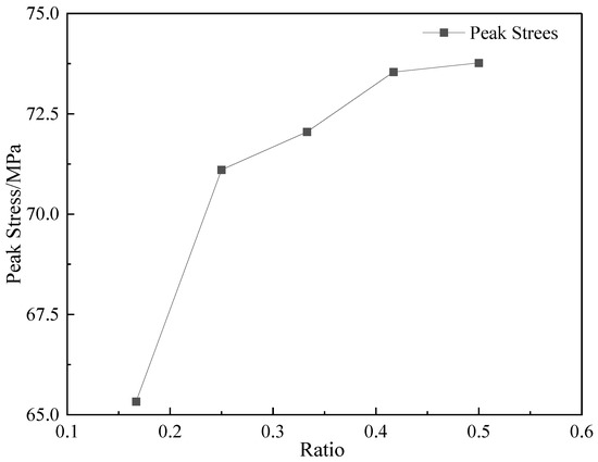On account of the analyzing results of the stress–strain curves above, the dynamic strength of each group of specimens was obtained, and the relationship between the dynamic strength and the corresponding variable is illustrated in Figure 10, Figure 11 and Figure 12. It can be seen from the Figures that the dynamic strength of the combination of the primary support and surrounding rock of each group show an increasing tendency with their variables.