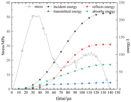 In order to study the relationship between energy consumption and rock fragmentation, the energy consumption of the typical specimen under different impact loads was analyzed. The variation law of the energy monitored in each bar in the testing process of the composite specimen is shown in Figure 13, from which it can be seen that the incident energy and the absorbed energy increase the fastest. The toroidal combination specimen is made of two parts, the primary support simulated by the pure concrete ring and the surrounding rock simulated by the sandstone ring. The inner diameter and outer diameter of the toroidal cement ring are 60 mm and 80 mm, respectively, and that of the sandstone ring are 80 mm and 160 mm. Four kinds of energy ratios increase along with the loading time, and the transmitted energy ratio has minimal growth, as shown in Figure 14. The testing results at several key points at the energy curves were selected to analyze the energy consumption characteristics of the combination of the primary support and the surrounding rock. The selected points include the start point, 50% of the first stress peak, the first stress peak, the middle of the first stress peak, the lowest point between the first stress peak and the second stress peak, the lowest point between the first stress peak and the second stress peak, the middle of the lowest point between the first stress peak and the second stress peak and the second stress peak, the second stress peak, 50% of the second stress peak after the second stress peak and the endpoint. The corresponding testing times to the above points are 0 μs, 13 μs, 38 μs, 51 μs, 71 μs, 93 μs, 114 μs, 131 μs and 140 μs. The ratio of reflected energy to incident energy, the ratio of transmitted energy to incident energy and the ratio of absorbed energy to incident energy, corresponding to all the key points are illustrated in Figure 14. The ratio of reflected energy to incident energy decreases first and then increases, while the ratio of transmitted energy to incident energy and the ratio of absorbed energy to incident energy change opposite to the first one, and similar to each other. Consequently, we can draw a conclusion that all kinds of energy change during the failure process of the combination structure and so as the energy ratios. The variation laws of energy consumption are similar during the course of failure of other composite specimens of surrounding rock and the primary support.