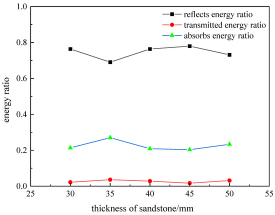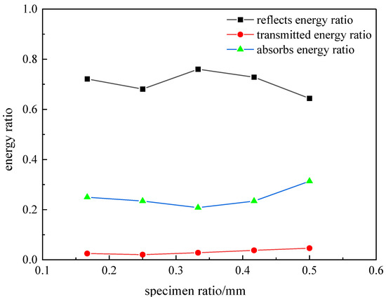 The energy variation curves of the composite specimens under different radial thicknesses of the concrete ring can be found in Figure 15. The ratio of reflected energy to incident energy and the ratio of absorbed energy to incident energy increase first and decrease later, while the ratio of transmitted energy to incident energy does not change significantly. The energy variation curves of the composite specimens under different radial thicknesses of the sandstone ring are shown in Figure 16. The ratio of reflected energy to incident energy first decreases, and then increases and decreases later, the change in the ratio of transmitted energy to incident energy is not obvious, and the ratio of absorbed energy to incident energy firstly increases, then decreases and increases later. The energy variation curves of the composite specimens under different ratios of the radial thicknesses of the concrete ring to the whole specimen’s radial thickness can be seen in Figure 17.