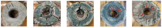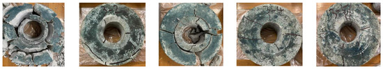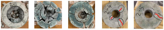 The radial thickness of the sandstone ring was changed in the second group of testing specimens and the physical failure states of the specimens after the impact loads acted can be found in Figure 19. The first three specimens were destroyed seriously and the latter two specimens were damaged slightly. The ratio of the radial size of the primary support to the whole size of the specimen was changed in the third group of the testing specimen and the physical failure states of the specimens are delivered in Figure 20. There are a great number of radial cracks and circumferential cracks produced in the first two specimens, and there are only radial cracks produced in the latter three specimens. According to the failure states of the above specimens, it can be seen that there are a radial failure and circumferential failure for the specimen under impact loads acted, which is consistent with the characteristics of rock blasting failure. It mainly manifested as shear cracks and tensile cracks, corresponding to shear failure and tensile failure as for the specimen.