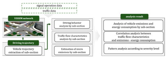 In this study, a road segment between two intersections was divided into sub-sections, and energy consumption and emission generation were analyzed. Since there are unique driving behaviors depending on the section of a road segment, energy consumption and emission generation patterns were identified. It was found that there were differences in energy consumption and emission generation in the various sub-sections according to traffic flow characteristics such as speed, delay, and acceleration. In addition, emissions and energy consumption were analyzed using cluster analysis. The findings in this study are expected to provide more detailed and quantitative data for better modeling energy consumption and emissions in urban areas. With the increase in the attention paid to public health, air quality is considered one of the criteria for selecting locations for facilities dedicated to vulnerable users, such as elementary schools and elderly care centers. This paper offers traffic-related air pollution information. However, this study has the following limitations: This analysis only considered passenger vehicles and did not include any truck traffic. However, it is known that emissions from diesel trucks account for a large proportion of road transport pollutants. Therefore, additional analyses, including other vehicle types, would present more accurate outputs. In addition, a section with a speed limit of 50 km/h was set as the analysis range in order to not consider changes in emissions due to changes in the speed limit. However, roads around children’s facilities, which are vulnerable to air pollution, tend to have lower speed limits. Therefore, in future studies, it is necessary to implement various road conditions and analyze the emission patterns that affect respiratory diseases. In addition, in this study, the unit of the sub-section was assumed, considering the average queue length at the intersection to reflect the change in vehicle delay and traffic flow characteristics. However, for more accurate pattern analysis, it is necessary to study the reasonable sub-section criteria that can derive the change in driving behavior at signalized intersections through additional research.