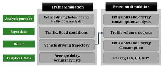 In this study, energy consumption and emissions were analyzed by utilizing VISSIM traffic flow simulations and the MOVES emission estimation model. Vehicle energy consumption and emissions by sub-section were estimated using acceleration and deceleration data derived from the trajectory data of individual vehicles (Figure 2).