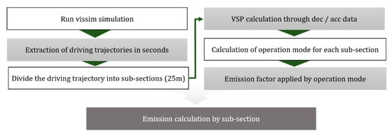 The trajectory data extracted from the simulation were processed. In this study, a road segment between two intersections was divided into 25 m sub-sections, and energy consumption and emissions were analyzed. The sub-section length was selected based on the average queue length of 22 m at intersections during off-peak hours. The microscopic emissions in each sub-section were calculated using the MOVES OP mode (Figure 3).
