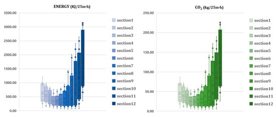 Analysis of variance was performed to statistically verify that energy consumption and emissions were different in the various sub-sections. Levene’s equal variance test was performed, and the null hypothesis was rejected at a significance level of less than 0.05 (significance probability of 0.00), indicating that equal variance was not assumed (Table 5).