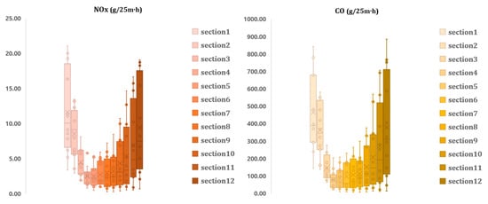 Unlike CO2, NOx and CO showed the largest emissions in sub-sections where vehicles accelerated. After acceleration, emissions gradually decreased, as shown in Figure 6.
