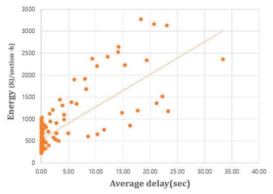 Three traffic flow characteristics that were highly correlated with energy consumption and CO2 were average speed (km/h), average delay (s), and occupancy rate (%). Among them, the correlation coefficient of average delay (s) was 0.76, as shown in Table 8, which was the highest positive correlation. It was found that energy consumption and CO2 generation increased in the sections where the average speed was low, and that delay occurred with a high occupancy rate, as shown in Figure 7.