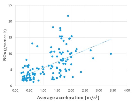 Two traffic flow characteristics correlated with NOx and CO emissions were average acceleration (m/s2) and average delay (s). Average acceleration (m/s2) showed the highest positive correlation, as shown in Table 9. It was found that the amount of NOx and CO generation increased in the sections where the acceleration of vehicles was high, as shown in Figure 8.