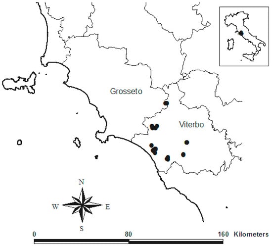 The study area corresponded to the province of Viterbo (central Italy; Figure 1), whose agricultural landscape hosts the most southern population along the Tyrrhenian coast [27].