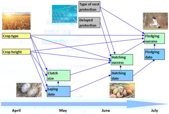 We found that, in April and May, the crop type and height directly and significantly influence the laying date and the clutch size. By contrast, we have not found evidence that the laying date significantly influences the clutch size. In June, the hatching success is directly and significantly determined by three biological (laying date, clutch size and hatching date) and two management (type and delay of nest protection) variables. Instead, we could not find evidence that the environmental factors (crop type and height) directly affect the hatching success, thus their influence resulted only indirect through their effects on the laying date and clutch size. In July, the fledging success is directly and significantly regulated by one management (type of nest protection) and two biological (hatching success and fledging date) factors. Again, we have not found evidence that the environmental factors directly affect the fledging success; thus, their influence is only indirect through their effects on the parent variables.