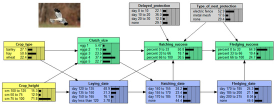 where xT represents the vector of states of the target variables (e.g., intermediate hatching success and high fledging success) and e represents the vector of evidence of parent variables (e.g., crop type = “wheat”, crop height = “100–125”, type of nest protection = “electric fence” etc.). By using Bayesian inference, changes in the probability of the hatching and fledging success (low, intermediate and high) were calculated given the changes of some other variables for each of the scenarios simulated. Bayesian network modeling and simulations were carried out using Netica 6.08 [33,34,35].