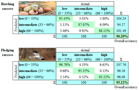 The explanatory power (i.e., accuracy) of this model was high for both the hatching success and the fledging success (Figure 4). Overall, the hatching success was classified with 90.20% accuracy (i.e., 9020 trials out of 10,000), and the fledging success with 95.12% accuracy (i.e., 9512 trials out of 10,000).