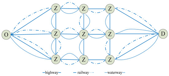 We suppose that the multimodal transport network is composed of , where is the point set representing the nodes through which goods are transported, ; is the arc set, where and are the sets of transport modes, where and are the starting point of multimodal transport; is the end point of multimodal transport,. A regional intermodal network has transport nodes with modes of transport between each node. At the starting point , reefer containers have to be transported to the end point within the time window specified by the customer. The combination of transportation modes and transportation routes with transportation cost, carbon emission cost, a time window penalty cost, and the sum of damage cost of cold chain goods as the objective function can minimize the total cost of the transportation process. The transportation network diagram is shown in Figure 1.