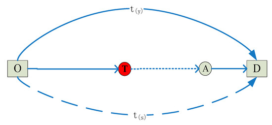 This study assumes that a shortest route exists between two nodes in the highway traffic network, the road congestion coefficient affects the vehicle speed , and the route length and vehicle speed affect the travel time . Due to the time-varying characteristics of the highway traffic network, an unexpected traffic event occurs at point A when the vehicle travels on the shortest route between two nodes to point T, as shown in Figure 2. The capacity of section TA is bound to decline, resulting in the vehicle travel time changing to , and the travel time function of the shortest route is . If similar situations occur on multiple sections of the shortest route between two nodes, then . is the driving time of vehicles on road section without congestion, then , where represents the length of road section without congestion on the shortest route , , and represents the actual driving speed of vehicles on road section without congestion on the shortest route , .