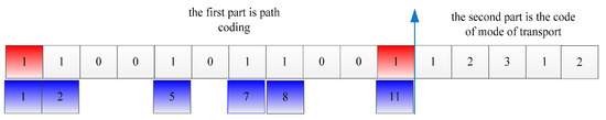 - Chromosome coding.In this study, a multi-parameter joint coding method is adopted. In the coding process, a chromosome is divided into two parts. The first part is route coding, which indicates whether all cities have gone through 0–1 coding (the first and last nodes are determined to be 1, the middle nodes that have not gone through are coded to be 0, and the passed nodes are coded to be 1). The second part is generated according to the first part. The number of generated nodes is the number of urban nodes minus 1, indicating the mode of transport (expressed by 1–3). No air transport mode code exists, and 1–3 represent the three modes of transport, namely, highway, railway, and water transport. The corresponding chromosomes in the first and second parts are shown in Figure 3. The two corresponding chromosomes in the first part 1-1-0-0-1-0-1-1-0-0-1 and the second part 1-2-3-1-2 are shown as follows: Road transport is selected from node 1 to node 2, railway transport is selected from node 2 to node 5, water transport is selected from node 5 to node 7, road transport is selected from node 7 to node 8, and railway transport is selected from node 8 to node 11. So, in this pattern, the mode of transport part codes the mode of transport on the line. In this way, any multimodal transport scheme from the beginning to the end can be represented.