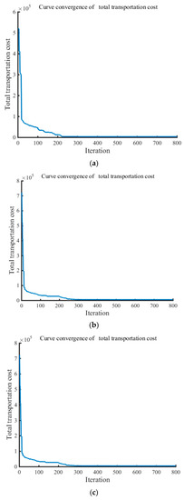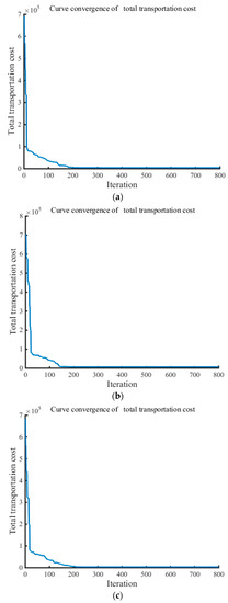 A static model refers to the minimum optimization of the total cost of a multimodal transport carrier considering transport cost, carbon emission cost, time window cost, and cargo damage cost in the deterministic mode without considering the influence of traffic congestion, external environment, and transport vehicle failure on the transport time of various modes. Matlab2014b was used to solve the three tasks in 28.44 s. The optimal route of multimodal transportation is shown in Table 6. The minimum total cost of the three tasks is 13,286.03 yuan. The cost convergence curve of multimodal transport for three tasks in static mode is shown in Figure 5, where (a) is the convergence curve of task I, (b) is the convergence curve of task II, and (c) is the convergence curve of task III. The abscissa is the number of iterations, and the ordinate is the total transportation cost of the objective function (unit: yuan).