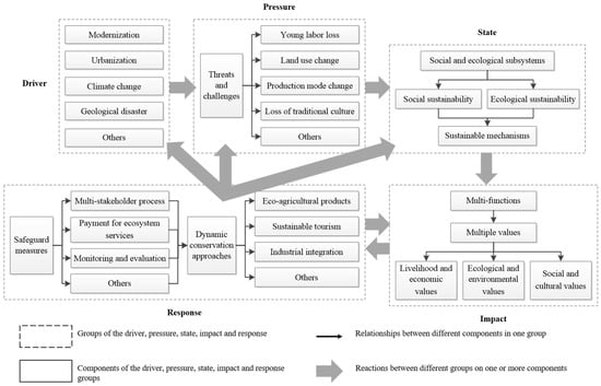 The DPSIR model is a problem structuring approach that is widely used in environmental management. It allows the cause–effect relationships between anthropogenic activities and their environmental and socio-economic impacts to be explored and described in a sequential manner, which is in line with the characteristics of IAHS and their conservation. The DPSIR-based analytical framework provides an effective way to fully understand the social and ecological background of heritage sites and analyze the threats and challenges faced by IAHS in depth. Using this framework, managers can formulate effective IAHS conservation and development measures that are consistent with local social and ecological conditions, and can be constantly adjusted with the changing pressures, so as to maximize the IAHS conservation effectiveness while promoting regional economic development. When this framework is applied to the SDSTS, thirty-four conservation and development measures from six aspects have been proposed, among which seven measures of ecological conservation and six measures of cultural inheritance are conservation approaches in the traditional sense. However, five measures of organic product development and seven measures of sustainable tourism development are all dynamic conservation approaches that will enable local farmers to benefit from the SDSTS conservation as well as promote the economic development of the heritage site.