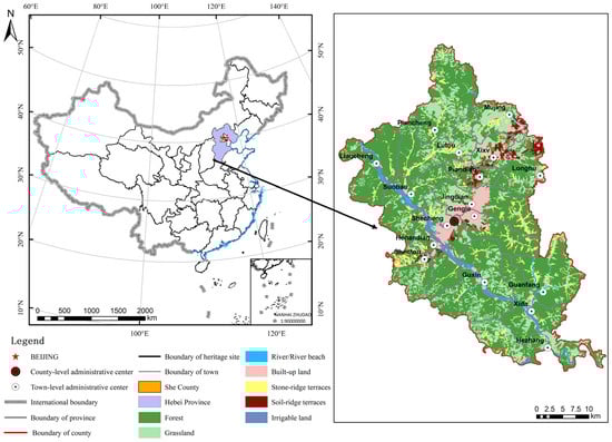 The Shexian Dryland Stone Terraced System (SDSTS) is located in She County, Handan City, Hebei Province, China. She County is situated in the eastern foothills of Mount Taihang and at the junction of the Shanxi, Hebei, and Henan provinces. It is bordered between 36°17′ and 36°55′ north latitude and 113°26′ and 114°00′ east longitude. The heritage site is demarcated within the towns of Jingdian, Gengle, and Guanfang on the southeastern end of She County where the largest and most representative stone terraced fields are distributed (Figure 2). The heritage site is comprised of 15 administrative villages from Jingdian Town, 15 administrative villages from Gengle Town, and all 16 administrative villages of Guanfang Town, making for a total of 46 administrative villages. She County covers an area of 1509 km2. The total area of the heritage site is 204.35 km2, of which the area of stone terraced fields is 27.68 km2.