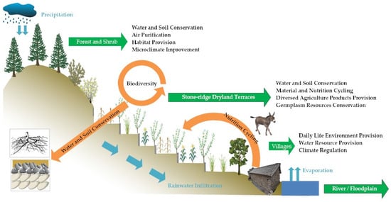 The distinct landscape features have enabled the SDSTS with important ecological functions and to maintain ecological stability under extreme conditions (Figure 4). The forests and shrubs at the top of the mountains can reduce the soil erosion, improve the microclimate of the local regions, provide habitats for the flora and fauna, and purify the air. The stone terraced fields are able to maintain the soil and water, achieve the cycling of nutrients and other materials, provide abundant agricultural products, and protect germplasm resources [49,50]. The villages not only provide locals with a good living environment, but also play important roles in harvesting the rainfall to replenish the water supplies and intergenerational cultural transmission. The river beaches are relatively flat and provide a certain area of arable land for the local population. Seasonal river flows not only provide the local population with water during the rainy seasons, but also regulate the local microclimate through evapotranspiration.