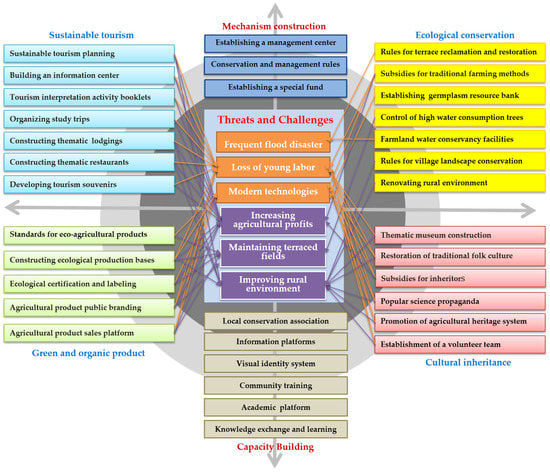 Experiences from World Cultural Heritage indicate that the main objective of heritage management must be to improve people’s quality of life and social interaction [59] and good management may have mid- and long-term socio-cultural and economic impacts [60]. Thus, heritage management is now broadening the scope from conserving the heritage in isolation to integrating heritage resources into sustainable rural and urban development [60,61]. On the contrary, unsuitable management will result in the destruction of the heritage. For example, the Ifugao terraced landscape in the Philippines was destroyed due to unsustainable tourism development [62]. It is also true for IAHS. People increasingly recognize that effective conservation and development plays a very important role in maintaining the sustainability of IAHS, as their vulnerability will make many processes irreversible, and once damaged, it will inevitably lead to the loss of their functions and values [22]. Moreover, as IAHS are living systems, their conservation must be conducted in a dynamic way so that local farmers can benefit from heritage conservation while the heritage site can seek sustainable development [8,12].
