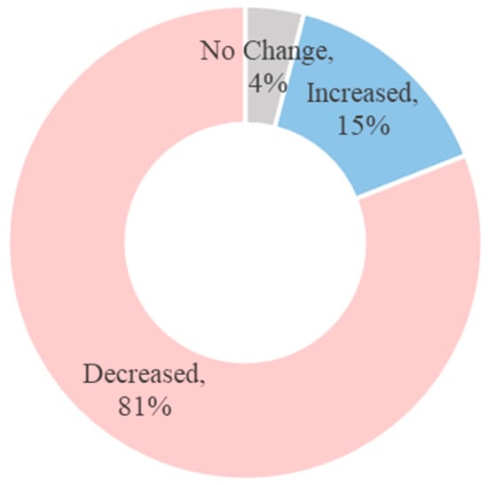 When examined, 81% of these small-scale businesses recorded a decline in their daily profits. This means that for every 100 small-scale businesses, 81 experienced a decline in original profits or before a pandemic occurs (Figure 6). Before the pandemic, the daily profit of all respondents totaled RM 90,171 a day. In contrast, during the MCO, the profit per day of all respondents recorded was RM 48,631. This means that they lost RM 41,540 per day in total during the MCO.