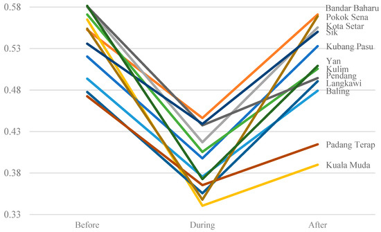 The districts that rose showed improvement in the business level before and after are Bandar Baharu, Pokok Sena, Kubang Pasu, Sik and Langkawi. This situation is clearly depicted in the changes and differences in business level maps by district in Kedah (Figure 8). Although all districts were affected during the MCO period, the Kuala Muda district is most affected or failed to recover to the same level as before the MCO, remaining at a low level even after the MCO. On the other hand, the Bandar Baharu, Pokok Sena, Kota Setar and Sik districts maintained a high business level before and after the MCO. Therefore, Hypothesis 2 is proven to be false.