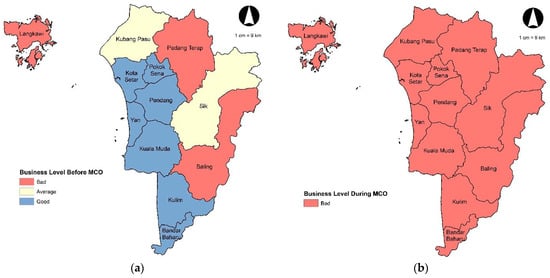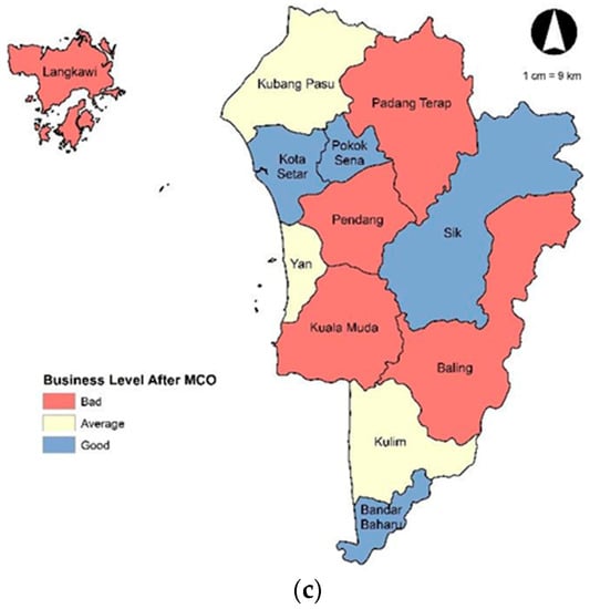 This state, famous for its rice granaries which attract tourists, malfunctioned due to the occurrence of COVID-19, consequently affecting small-scale businesses. The number of tourists declined in 2020 (Table 4) and 2021. When asked about the ability to survive if the full MCO implemented a second time, 30.8% of small-scale businesses in Kedah felt their business could persist, 27.5 % felt otherwise, while 41.75% were uncertain. This is very serious concern, as the full MCO has been implemented again in 2021 and continues to this day. These findings are also in line with the Department of Statistics Malaysia [44], which found in their survey that 71.4% of self-employed respondents have savings for less than a month. This is not enough for small-scale businesses to survive on if the MCO is reimplemented. The level of businesses, especially to these small-scale businesses, are highly dependent on the traffic movement in the surrounding environment. When the selected location is high traffic movement in the community, the probability of receiving customers elevates. The business levels in all districts before the MCO or before COVID-19 were at low, medium and high levels, and each was considered clustered. From a geographical point of view, it means that these regions are interconnected and interact with each other.