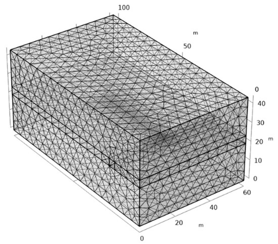 As shown in Figure 3, the finite element model is derived from the engineering simplification of a deep first coal seam in Dashu Village Mine. COMSOL is used to construct a three-dimensional finite element model of coal seam. The size of the model is 60 × 100 × 44 m, the roof and floor of 20 m thick above and below the model are breathable rocks, the middle 4 m is coal seam, and the width and height of the roadway are 3 m. The borehole is located in the middle of the coal seam, with a length of 60 m and a depth of 12 m in the sealing section. The upper part of the three-dimensional model is set as the stress boundary, and the lower part is set as the fixed boundary. Left, right, and back are rolling boundaries. The absolute pressure of roadway in coal seam is 0.1 Mpa. See Table 1 for specific parameters [31].