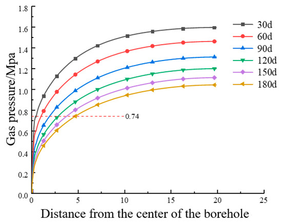 As can be seen from Figure 4, the effect of gas extraction time on effective extraction radius is significant. The effective extraction radius of borehole gas extraction 30 d is 0.63 m, and that of borehole gas extraction 60 d is 1.23 m, which increases the extraction range by 2 times. The effective radius was 2.57 m during 120 days of pumping, and the pumping range increased by 4 times. The effective radius was 3.79 m during 180 days of extraction, and the extraction range was increased by 6 times. The above analysis shows that the effective extraction radius increases with the increase in time.