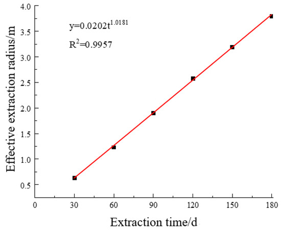 It can be seen from Figure 5 that effective extraction radius is a power exponential function relation with extraction time, and the correlation coefficient is 99.57%. The specific mathematical relation is as follows: