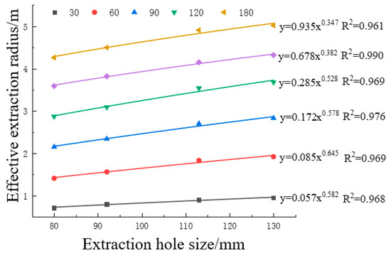 According to Figure 6, at 60 days of pumping, the effective extraction radius corresponding to the aperture of 83 mm, 92 mm, 113 mm and 130 mm is 1.41 m, 1.56 m, 1.83 m and 1.92 m. At 120 days of pumping, the effective pumping radius of different boreholes is 2.87 m, 3.09 m, 3.54 m and 3.68 m, respectively. Compared with 60 days of pumping, the effective pumping radius increases by 1.46 m, 1.53 m, 1.71 m and 1.76 m, respectively. The effective pumping radius at 180 days was 4.26 m, 4.5 m, 4.91 m and 5.04 m, respectively, which increased by 1.39 m, 1.41 m, 1.37 m and 0.7 m compared with the effective pumping radius at 120 days. The effective extraction radius ranges of 180 days of extraction are 0.24 m, 0.41 m and 0.11 m, respectively. According to the above analysis, the effective extraction radius of the borehole increases with the increase in the aperture in the same extraction cycle, but the increase range will gradually decrease. There is no linear relationship between the effective extraction radius of the borehole and the bore diameter. It can be seen from the fitting curve in Figure 6 that the relationship between the two conforms to the power function: