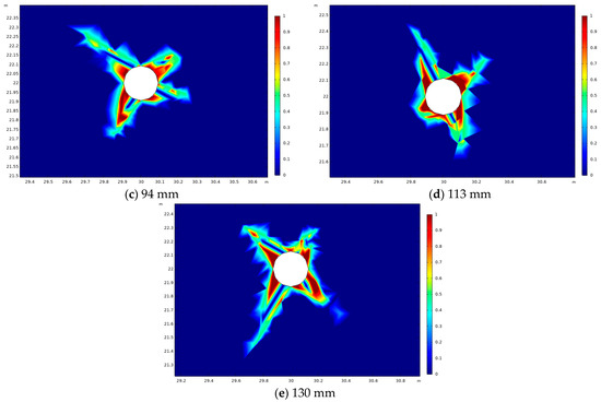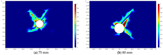 As can be seen from Figure 6, with other conditions unchanged, the slope of the relationship curve between effective extraction radius of borehole gas and extraction time increases with the increase in borehole aperture, and the effective extraction radius of borehole increases continuously. This is mainly because the stress field around the borehole will be redistributed after the excavation of the borehole. When the stress of the coal is greater than the strength of the coal, a certain plastic failure area will appear around the borehole. With the increase in borehole aperture, the coal body around the borehole is affected by drilling disturbance, and the contact area with the coal wall is also increasing. Under the action of secondary stress, a small pressure relief ring is formed, and the scope of plastic failure area around the borehole is also expanding. The damage degree of deep coal body around the borehole gradually decreases with the expansion of disturbance radius. Under the action of negative pressure extraction by borehole in the relief ring, a large amount of gas desorption makes the coal body shrink, deform and crack expand, and the permeability of coal seam improves. Figure 7 shows the plastic failure zone around the hole after drilling with different holes.