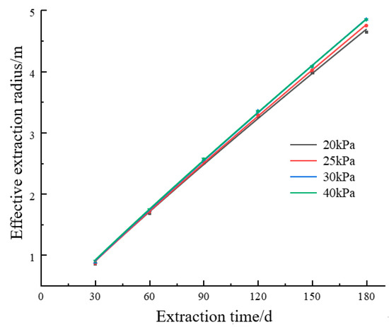 It can be seen from Figure 8 that the fitting curves of effective extraction radius with extraction time under different extraction negative pressures almost coincide. When the extraction time is 60 days, the effective extraction radius under the negative pressure of 20 kPa, 25 kPa, 30 kPa and 40 kPa is 1.68 m, 1.71 m, 1.73 m and 1.74 m, respectively. The effective extraction radius at 120 days is 3.27 m, 3.29 m, 3.35 m and 3.35 m, respectively. At 180 days of pumping, the effective pumping radius of 30 kPa and 40 kPa is 4.85 m, while the effective pumping radius of 20 kPa and 25 kPa is 4.65 m and 4.75 m. It shows that in a certain extraction time range, the higher the negative pressure, the larger the effective extraction radius, but the increase range of effective extraction radius is limited. The optimal extraction negative pressure of Dashucun mine is 30 kPa.