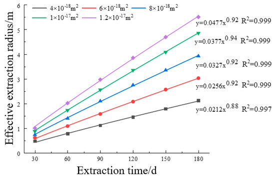 According to Equation (16), the relationship between effective extraction radius and initial permeability can be written:
