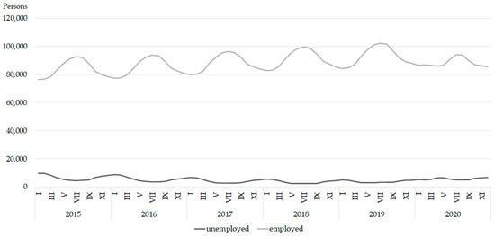 Unemployed and employed persons in the observed region from 2015 to 2020, according to data from references [59,60].