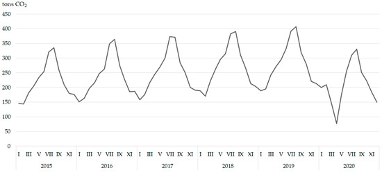 Monthly CO2 emissions of road traffic (in tons) for the period from 2015 to 2020 in the Učka Tunnel—calculation based in BINA Istra data (number of vehicles and vehicle categorization).