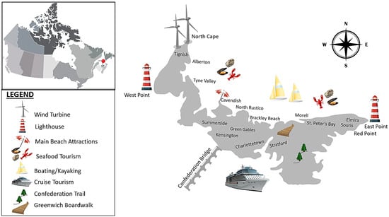 - MacEachern, A.; MacDonald, E. The Summer Trade: A History of Tourism on Prince Edward Island; McGill-Queen’s University Press: Halifax, NS, Canada, 2022. [Google Scholar]