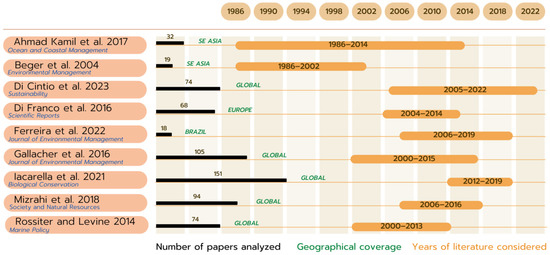 According to the IUCN, an MPA is “any (protected) area of intertidal or sub-tidal terrain, together with its overlying water and associated flora, fauna, historical and cultural features” [52] (p. 98). For the purpose of this paper, all marine protection statuses were considered; hence, no distinction was made among, e.g., national parks, marine reserves, MPAs, etc. This is in line with similar reviews run by other authors in recent years, e.g., [42]. As an initial step, before running the review, we have contextualized our work and compared it to the reviews already present in the literature in terms of research goals, year of publication, geographical coverage and number and time interval of papers considered. The approach followed for the review was that reported by Pullin and Stewart (2006) [53], which has already been successfully tested (e.g., [36,44]). We ran Boolean research on the Scopus database. The type of literature included scientific articles, books and book chapters. Although they could add potential benefits in terms of limiting publication bias [54], grey literature and MPA reports were not considered due to both resource limitations and the difficulty of gathering this material for global MPAs, as well as to the need of keeping research activities within a tight time frame. Both the research and the consequent review were performed between May and September 2022. Manuscripts in different languages (i.e., English and Spanish) were reviewed and processed. When deemed necessary, the papers’ Supplementary information was analyzed. The papers considered were published between 2005 and 2022. The details of the literature research are summarized in Table 1.
