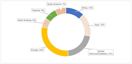 The most common continents of affiliation of first authors of selected studies were Europe (28%) and North America (21%), all others being ≤6%. The most represented affiliation countries were the USA (24%), the UK (19%) and Australia (12%). All other countries (n = 18) were ≤6%, with 12 of them occurring only once. The largest number of studies was carried out in Europe (30%), followed by Central America/Caribbean (21%) and Asia (15%) (Figure 2). None of the MPAs that were investigated by the papers we retrieved from the literature were located in areas beyond national jurisdiction (ABNJs). The list of the case studies presented in this review per country of origin is reported in the Supplementary Information. Specifically, Spain was the most represented country (n = 8 case studies), followed by Australia (6), Italy (5) and the Philippines, France and the USA (4 each). Of the papers assessed, 83% were published in journals with a 2021 impact factor ≤4 (66% of these are comprised in the 3–4 impact factor interval).