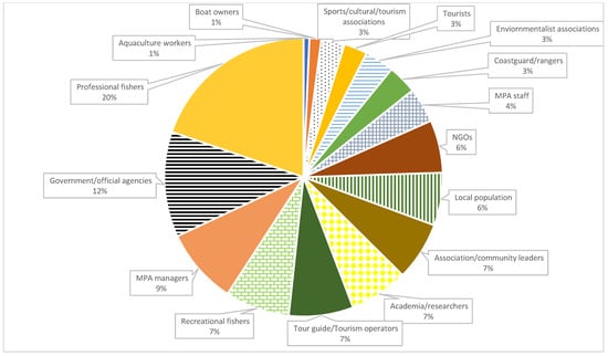 In papers reporting on studies based on interviews, the most commonly interviewed stakeholder group was that of professional fishers (nearly 20%), followed by government/official agencies (12%) and MPA managers (nearly 9%). All the other stakeholder classes (n = 13) were below 8% (Figure 3).
