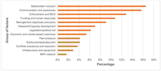 Group of factors for sustaining MPA effectiveness as derived from the literature review. Percentages refer to the number of factors (gathered in groups) suggested from each study over the total amount of factors suggested by the papers (n = 242). For instance, 40 different papers suggested stakeholder inclusion as a factor to sustain MPA effectiveness (40/242 = 16.5%).