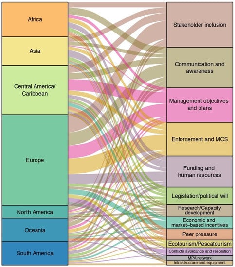 Groups of factors for MPA effectiveness per macro-region of origin. The size of the bands indicates the number of times each factor is suggested from each paper as well as from which macro-region. That is: the macro-region hosting the most case-studies in this literature is Europe, and the most common factor group suggested is “stakeholder inclusion”.