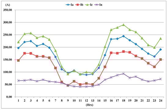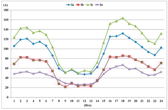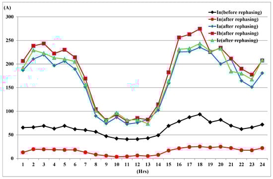 Figure 9 shows the results of the three-phase currents and neutral current of the primary trunk and laterals based on three-phase load flow analysis. In Figure 9, for instance, the three-phase currents and neutral current of the lateral section L2 were Ia = 131.8 A, Ib = 85.8 A, Ic = 163.7 A, and In = 66.7 A at the peak time of 6 PM. The loading of phase B was much lower than those of phases A and B. The results illustrate the severity of three-phase unbalance for the lateral because the neutral current In is even greater than Ib.