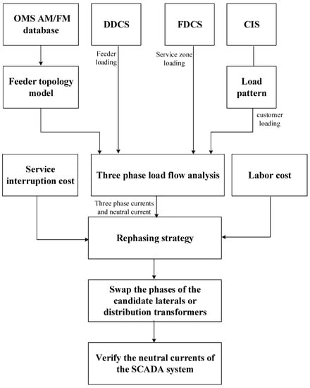 To solve the phase unbalancing problem of distribution feeders, the following procedures are applied to Taipower’s distribution systems and the flowchart of the phase-swapping work is illustrated in Figure 6.