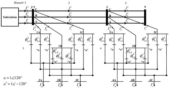 where and are the phase p current at the upstream branch i and at the downstream branch of the primary feeder, respectively; is the phase p current at the downstream lateral k; and k is the total number of downstream laterals at node j, which is connected with branches and .