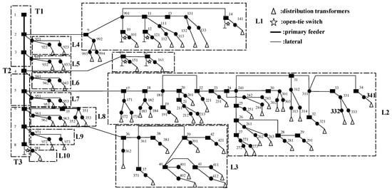 Taipower’s overhead feeder LY37, shown in Figure 8, was used for a computer simulation of lateral phase swapping in this section to balance the primary feeder, to illustrate the proposed MILP-based phase-swapping strategy. The total length of the 11 kV feeder is 5.7 km to serve the mixed loadings of industrial and residential customers. It consists of three service zones (T1, T2, and T3) on the primary trunk and nine service zones on the laterals with 103 units of OYD transformers and 58 units of 1-φ transformers to provide power service to >1000 low-voltage customers and 2 high-voltage customers. The three-phase unbalance problem diminishes service reliability and increases power loss (as mentioned in Section 2) because of the usage of many single-phase and OYD transformers in the feeders. The phase-swapping strategy for laterals and distribution transformers was derived using the MILP model to reduce the neutral current and annual energy loss.