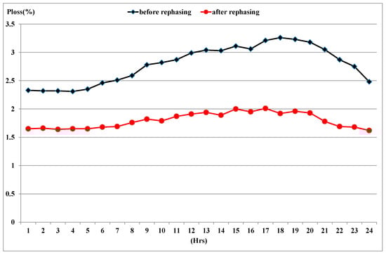 The reduction in feeder power loss was solved by three-phase load flow analysis for the test feeder before and after the phase swapping of the laterals. Figure 11 shows the loss percentage of the test feeder before and after phase swapping. The peak power loss decreased from 3.26% to 1.92% at 6 PM. The average daily power loss reduced from 2.8% to 1.8% by phase swapping three laterals.