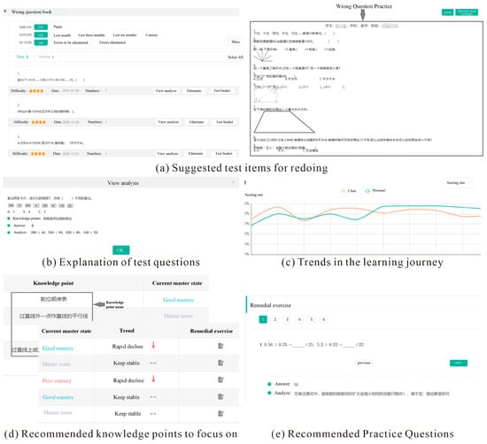 In this study, the prescriptive dashboard includes suggested questions, learning journey trends based on stage academic analysis, and suggested knowledge points (including learning resources and practice questions). The wrong question book module of the prescriptive dashboard automatically categorizes and consolidates test questions into student error books based on the cognitive diagnostic results, and requires students to practice on their own after class. Through the statistics of students’ learning history and visualization within a certain period, the prescriptive dashboard analyzes students’ stage learning processes as a whole, understands students’ individual learning and knowledge mastery in a certain stage, presents a graph of students’ personal information compared with class information, and provides a basis for students to master their learning fluctuations. At the same time, according to the results of academic prediction, the prescriptive dashboard accurately locates the weak points of students’ knowledge mastery and recommends personalized practice tests and other learning resources, as shown in Figure 2.