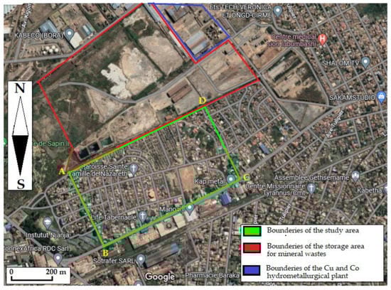 The Tshamilemba district is located near the center of the city of Lubumbashi, in the municipality of Kampemba. Tshamilemba is surrounded to the west by Ndjanja School, to the north by the mining company CHEMAF SARL and to the east by the Kabetsha district [12]. The north boundary of the study area (see the perimeter ABCD in Figure 1) is located close to an area used for the storage of mineral waste. These consist of solid residues from the hydrometallurgical processing of ores (3.2% Cu and 1.5% Co). According to [23], mineral waste contain on average 2.01% Cu and 0.32% Co present as chalcopyrite (CuFeS2), chalcocite (Cu2S), carollite (CuCo2S4), chrysocolla (CuSiO3.2H2O) and malachite ([CuCO3.Cu(OH)2]), accompanied by other minerals: pyrite (FeS2), chlorites ([Mg6Si4O10(OH)10]), hematite (Fe2O3), limonite ([FeO(OH).xH2O]), quartz(SiO2) and clay minerals.