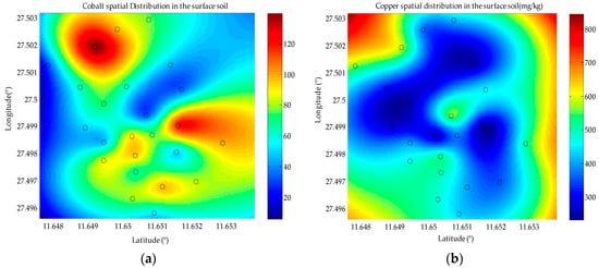 In surface soil, the average concentrations of cobalt (727.3 mg/kg), copper (401.34 mg/kg), iron (12,344 mg/kg) and zinc (730.13 mg/kg) were greater than the quality standards [26]. The same applies to the concentration of lead, which is among the most toxic or dangerous chemical elements to human health. The spatial distributions of metals observed in the Tshamilemba surface soil samples are depicted in Figure 3. A careful analysis of these spatial distributions reveals the build-up of metals in the surface soil. They also enable a visualization of the points with high metal concentrations. These points can be viewed as sources from where metals have spread or accumulated in the top soil inside the study area. The above prompts looking for a link between the area where stored mineral wastes undergo weathering processes responsible for the spread of toxic metals into the environment and high metal concentrations observed at some spots inside the study area. This applies also to variations in the concentration of metals observed along a given direction inside the study area. Establishing the aforementioned link is a very useful start for seeking or suggesting the most plausible dispersal mechanisms of metals into the soil of the study area.