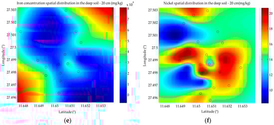 (a) Spatial distribution of cobalt in deep soil—20 cm. (b) Spatial distribution of copper in deep soil—20 cm. (c) Spatial distribution of lead in deep soil—20 cm. (d) Spatial distribution of zinc in deep soil—20 cm. (e) Spatial distribution of iron in deep soil—20 cm. (f) Spatial distribution of nickel in deep soil—20 cm.